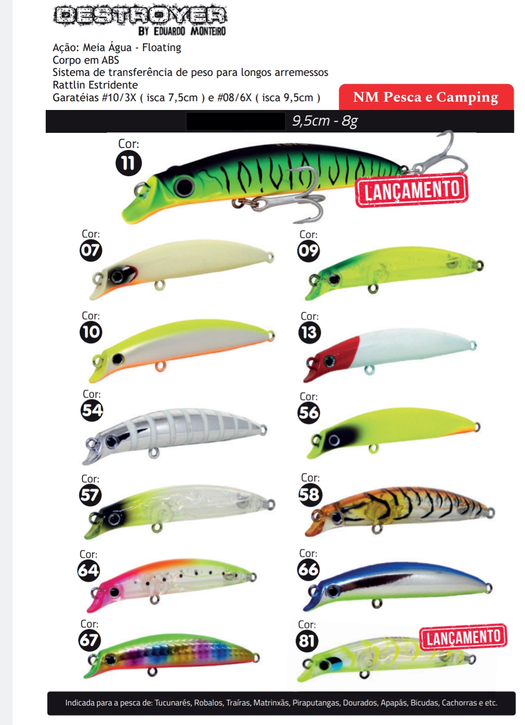 A Destroyer é uma isca de meia água, floating e sem barbela. Possui sistema de transferência de peso que faz com que a esfera interna se mova para a traseira da isca na hora do arremesso, ganhando maior distância. Quando ela começa a ser trabalhada, a esfera se move para a cabeça, atingindo maior profundidade no nado. Esse sistema também emite um rattlin estridente muito atrativo para os Tucunarés, Robalos, Traíras, Matrinxãs, Apapás, Piraputangas, Aruanãs, Tilápias, Xareletes, Baby Tarpons e etc.
