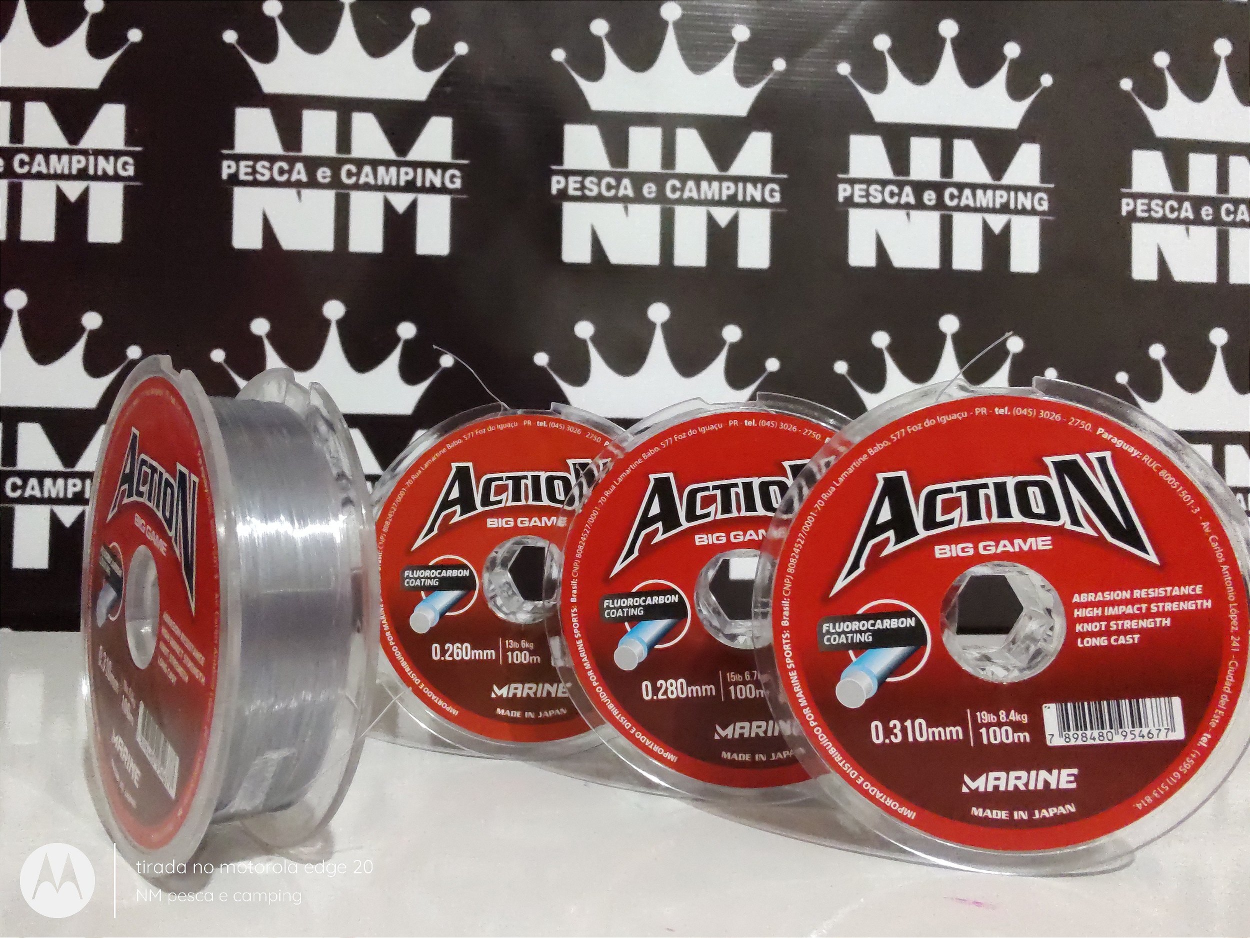 Linha Action Big Game da Marine Sports, monofilamento de nylon de altíssima qualidade, revestido com uma camada fluorocarbono que aumenta sua resistência e à abrasão.